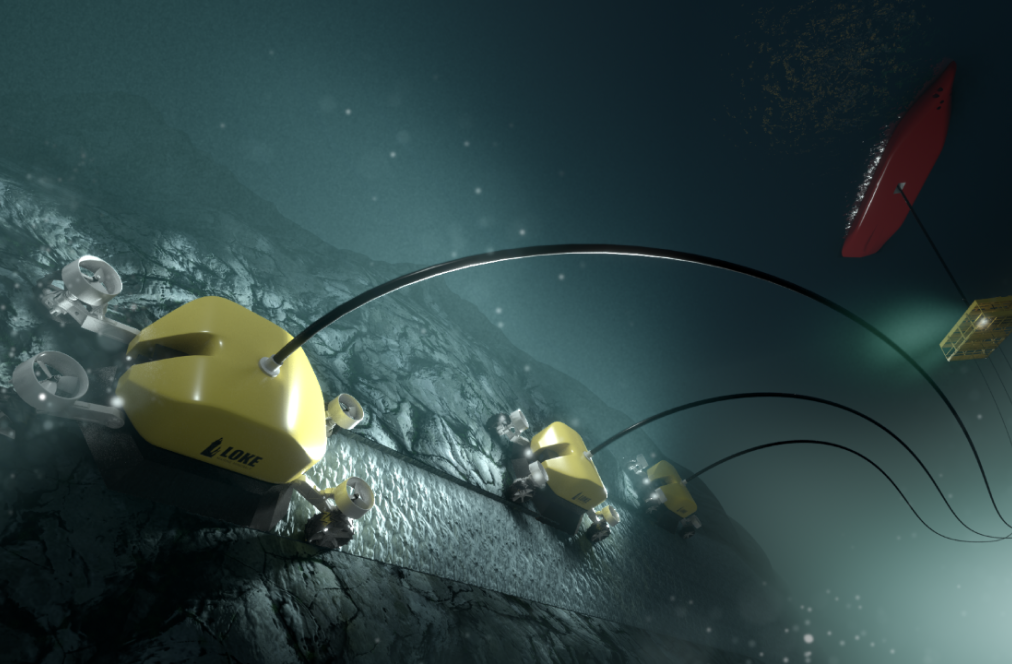 For manganese crust, a cutting and collection technology where several smaller free-swimming tools can operate in autonomous formation. Traction wheels with dedicated thrusters in addition to the suction force from the suction pumps for cuttings transportation will ensure that the tools can operate on very steep seamount sides. The cutter head mechanism is designed to accommodate very uneven surfaces and still deliver high recovery rate